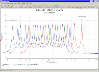 - The number of possible requirements are very high. Not only the number of EQ bands, the lowest and highest frequency of the bands can be different. This is the reason, why I can publish and simulated 8 band EQ only. If you like another versions, for example less or more bands, or higher frequency of the lower band, software simulation required to get the capacitor values and the resistor values to setting Q.